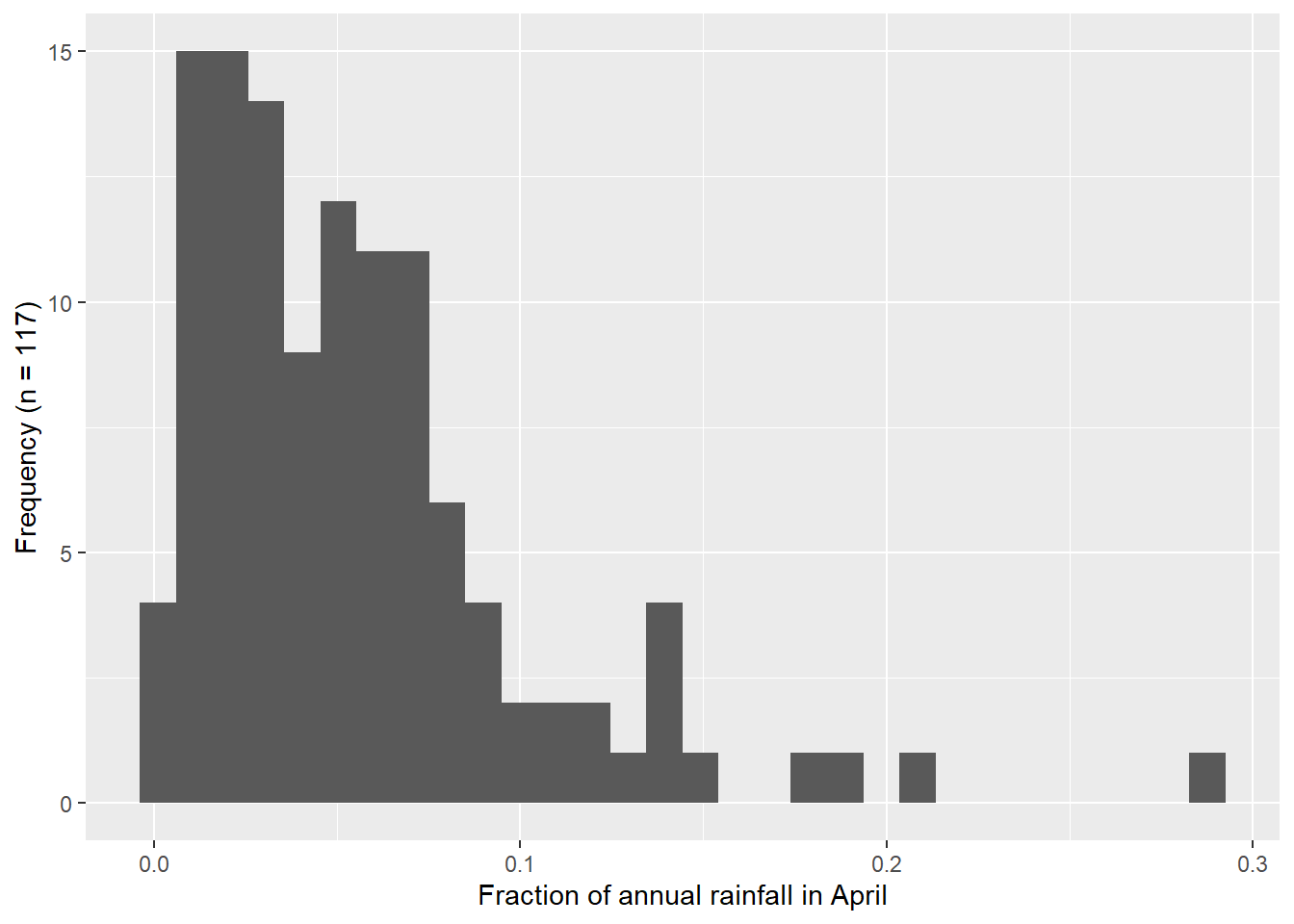 title = "Fraction of annual rainfall during April for Miami, Florida",