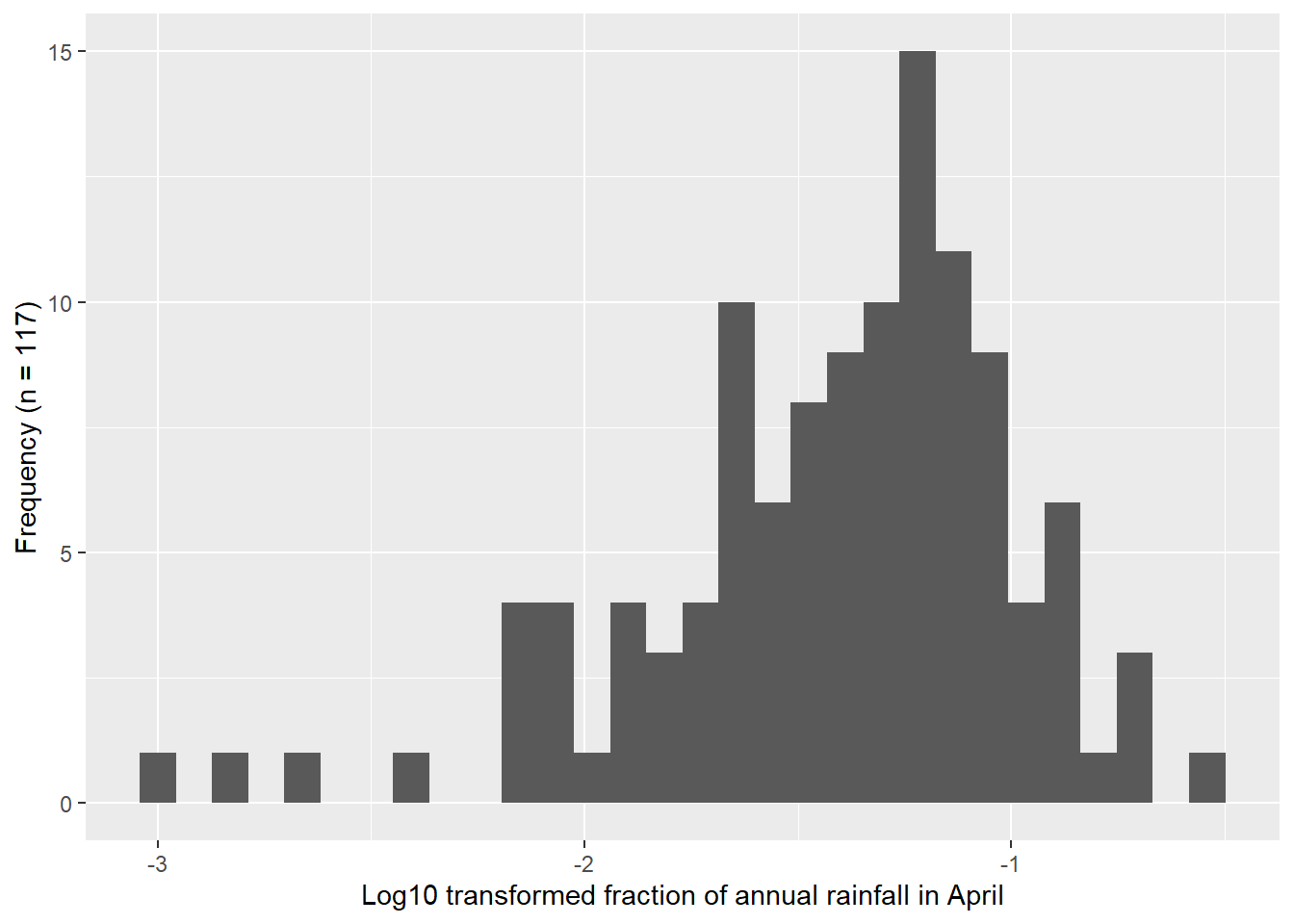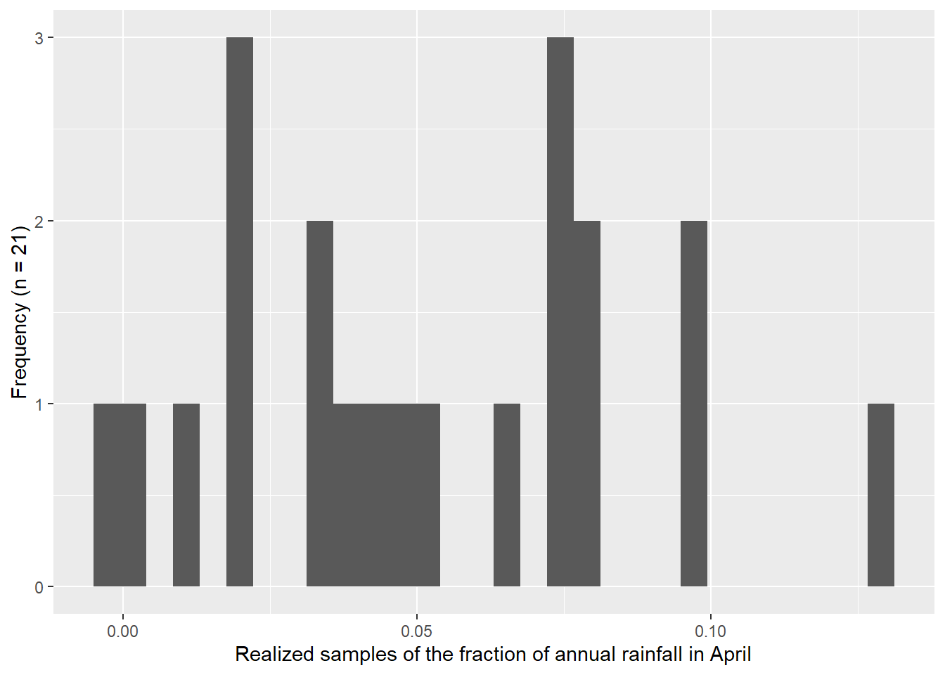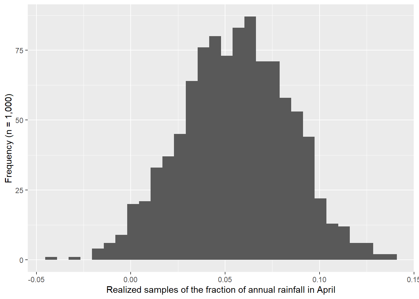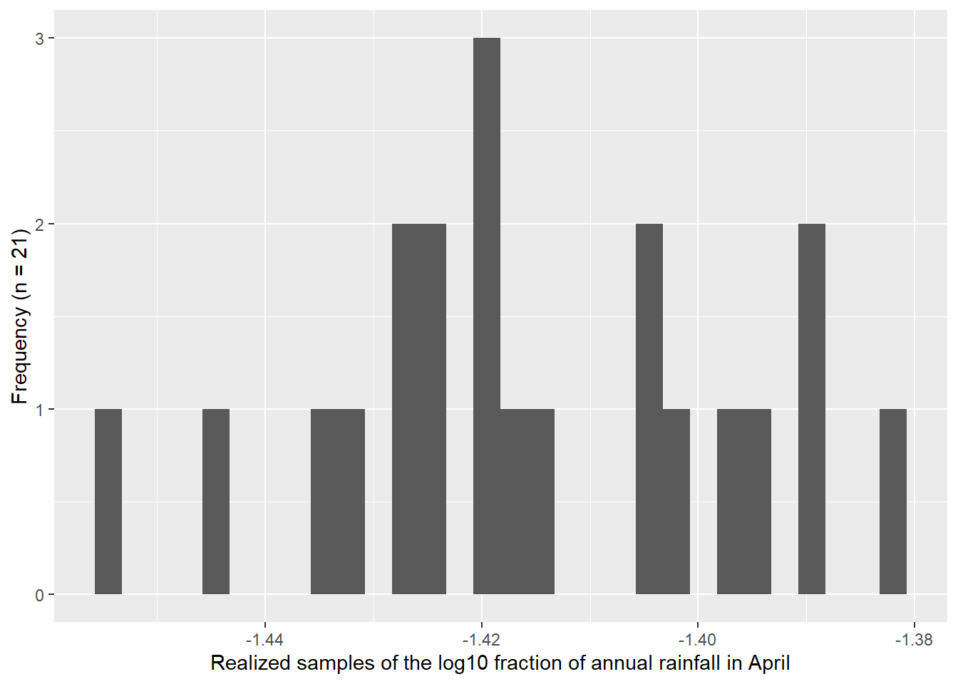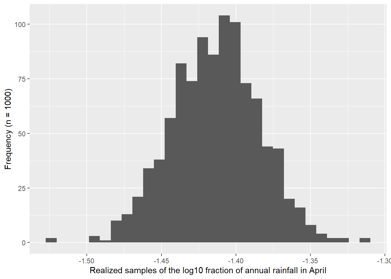xlab("Realized samples of the log10 fraction of annual rainfall in April") +