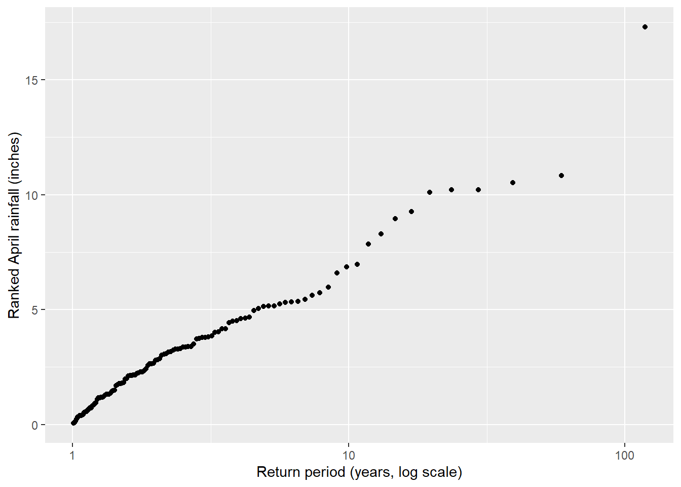 ) labs(x = "Return period (years, log scale)", y = "Ranked April rainfall (inches)")